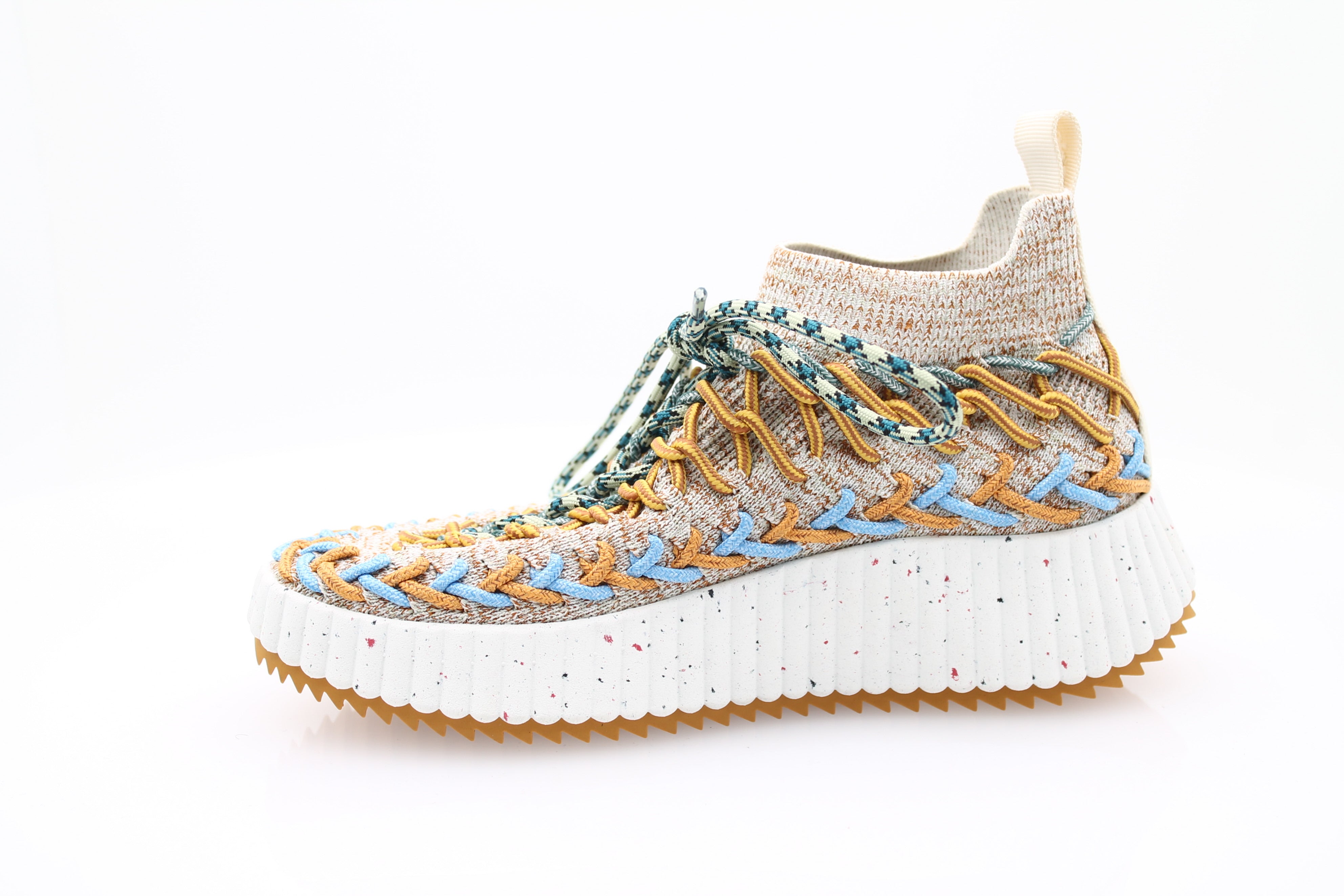 La Nama Sock Sneaker de Chloé se distingue par son design innovant en maille multicolore, mêlant nuances de beige et bleu dans une harmonie subtile. Inspirée du style running, cette sneaker chaussette offre une allure moderne et décontractée, parfaite pour dynamiser une tenue urbaine.